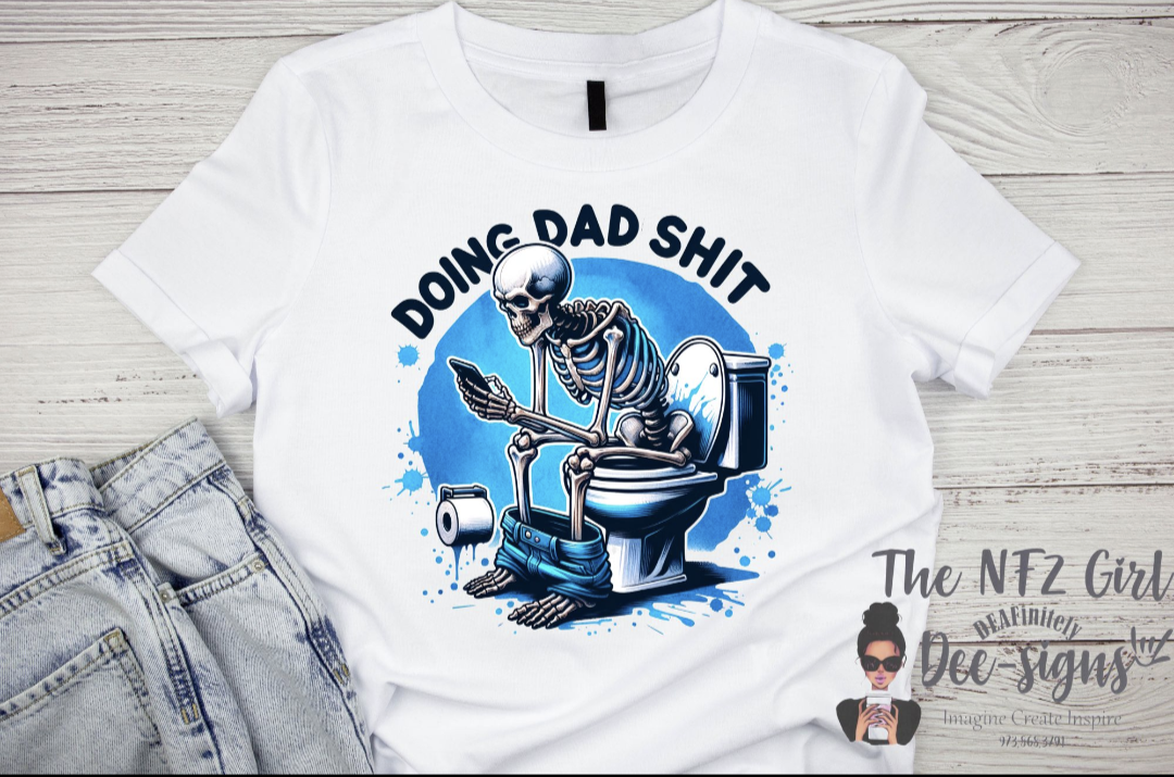 This Father's Day, celebrate with humor and style with our "Doing Dad Shit" T-shirt. Featuring a skeleton lounging on a toilet, scrolling through his phone, this shirt perfectly captures those relatable dad moments. Made from soft, comfortable fabric, it’s a playful yet practical gift that any dad will appreciate. Whether for laughs or lounging, it’s the ultimate tribute to fatherly downtime.